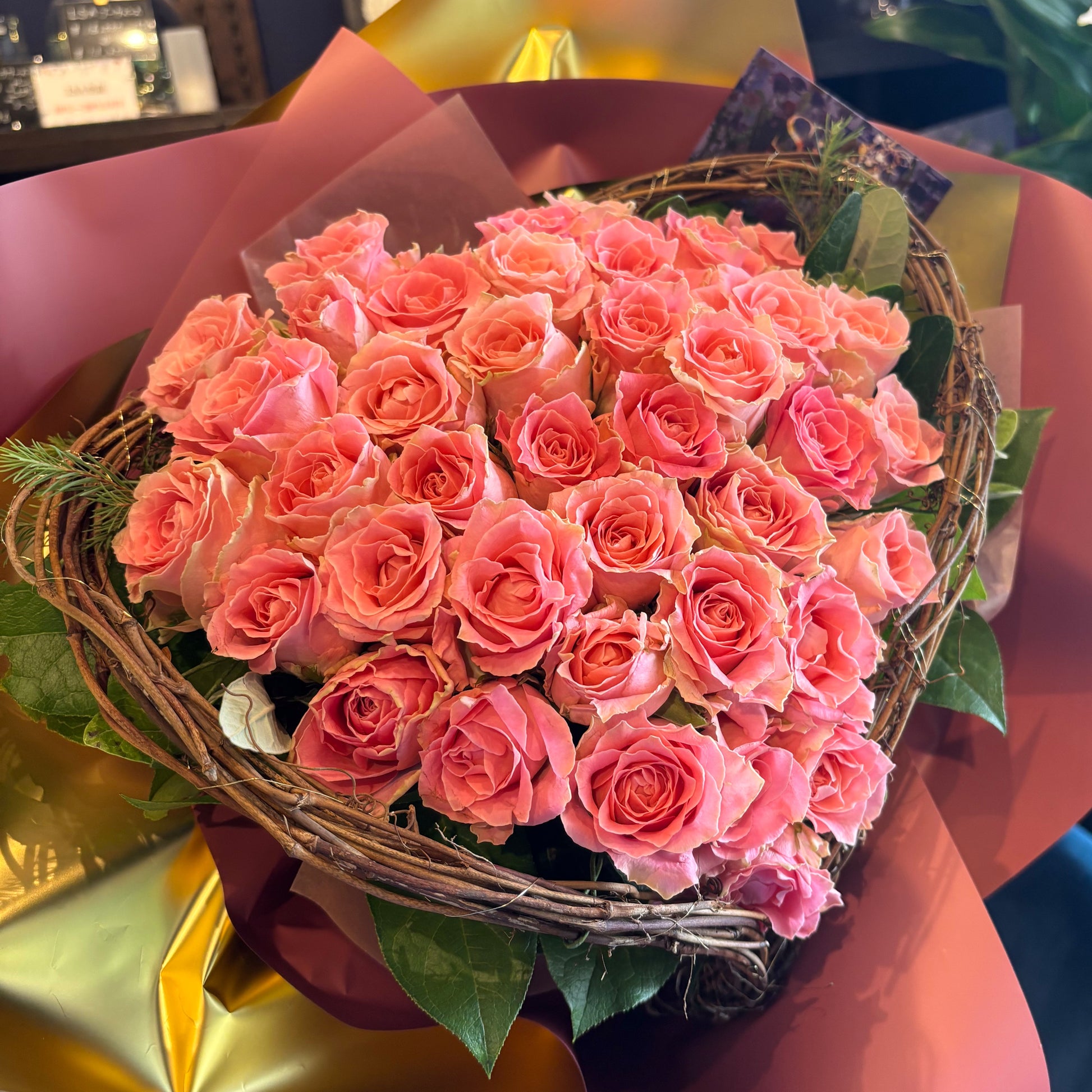 バラのハートブーケです。バラは30〜40本前後でお作りいたします。(時期、薔薇の大きさによって価格帯が変わります。何卒ご了承下さい)