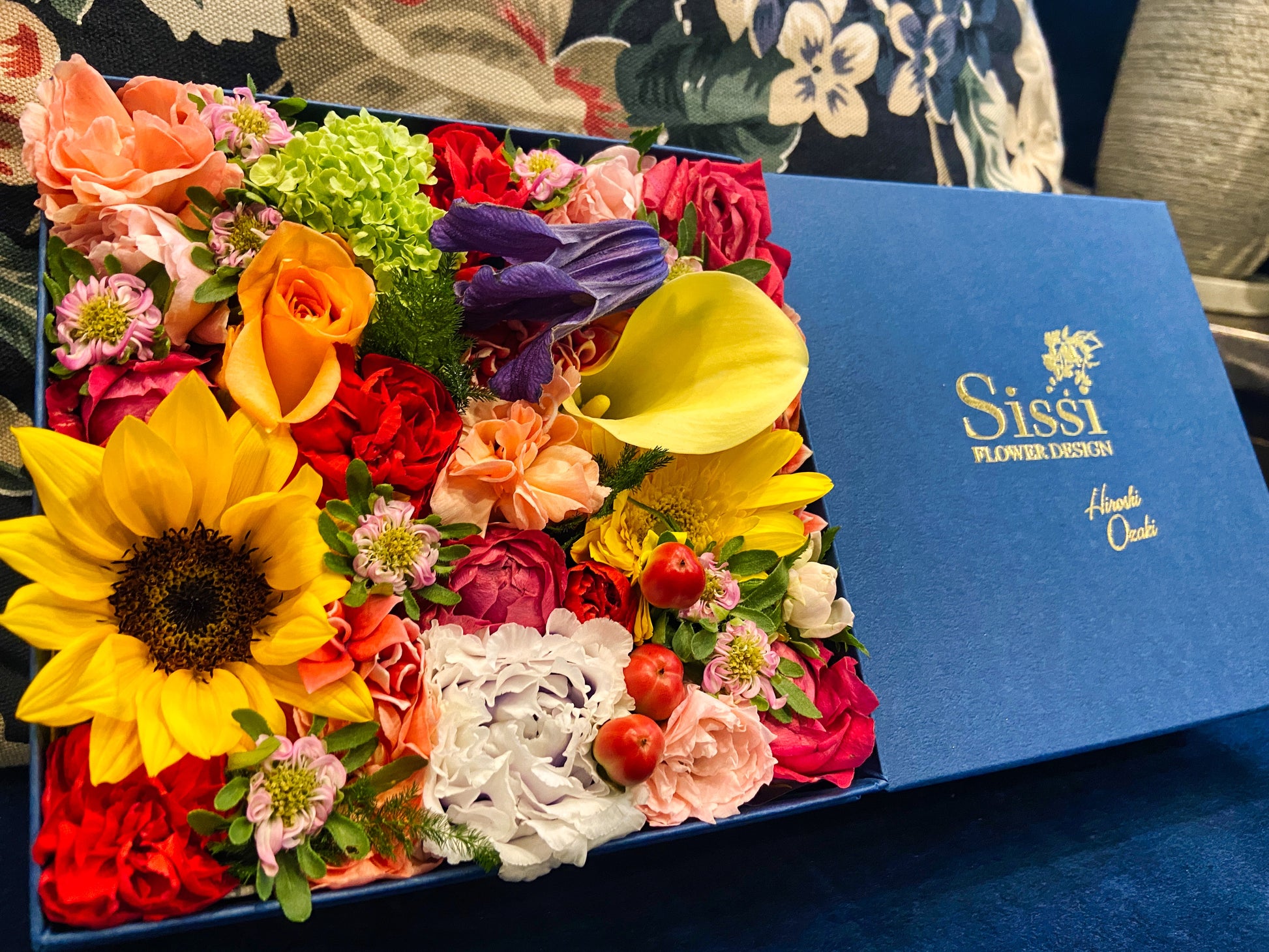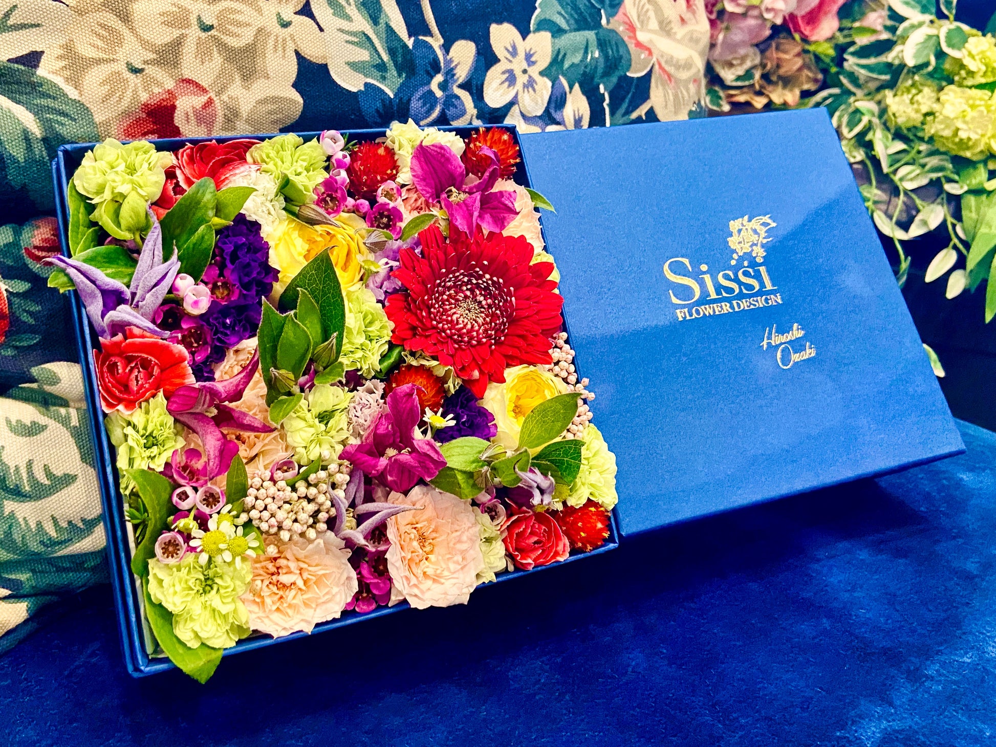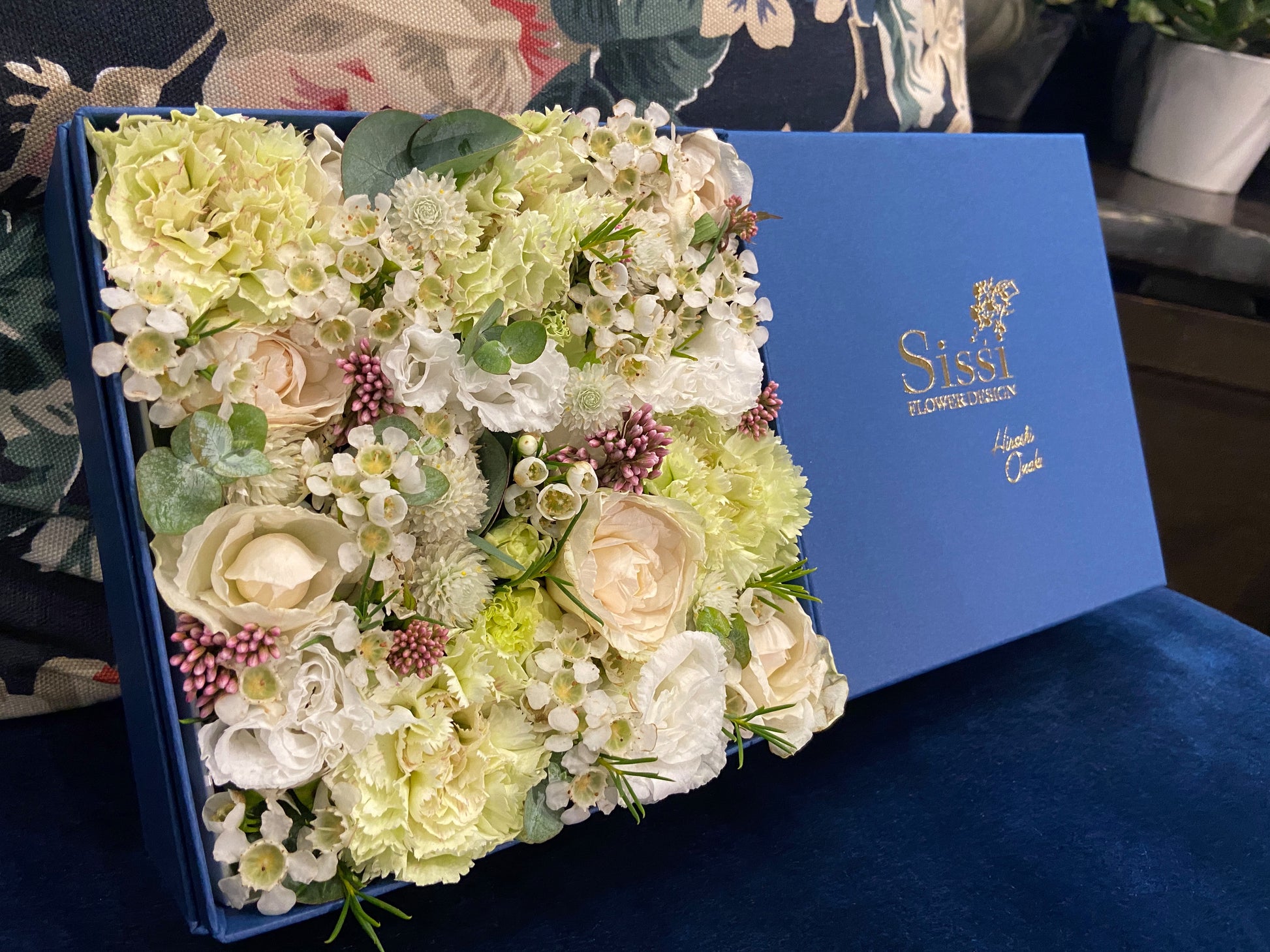 Sissiオリジナルボックスに贅沢にお花を敷き詰めました。 蓋を開けた瞬間に見えるお花に感動をお約束します。 Sissiのオリジナルボックスは高級感あるネイビーに横長の形で従来のボックスフラワーに比べて高級感があります。 男女問わず、色んなご用途のギフトとしてお贈りいただけます。 花の方は基本おまかせにさせていただいておりますが、ご要望があればお伝え下さい。 商品サイズ:縦15.5cm 横15.5cm 奥行7.4cm *アレンジメントは生花ですので、仕入れの状況などにより花材が変更になりますのでご了承下さい。 (お日にちに余裕をもってご注文くださればご希望により近いお花を制作させていただきます。)