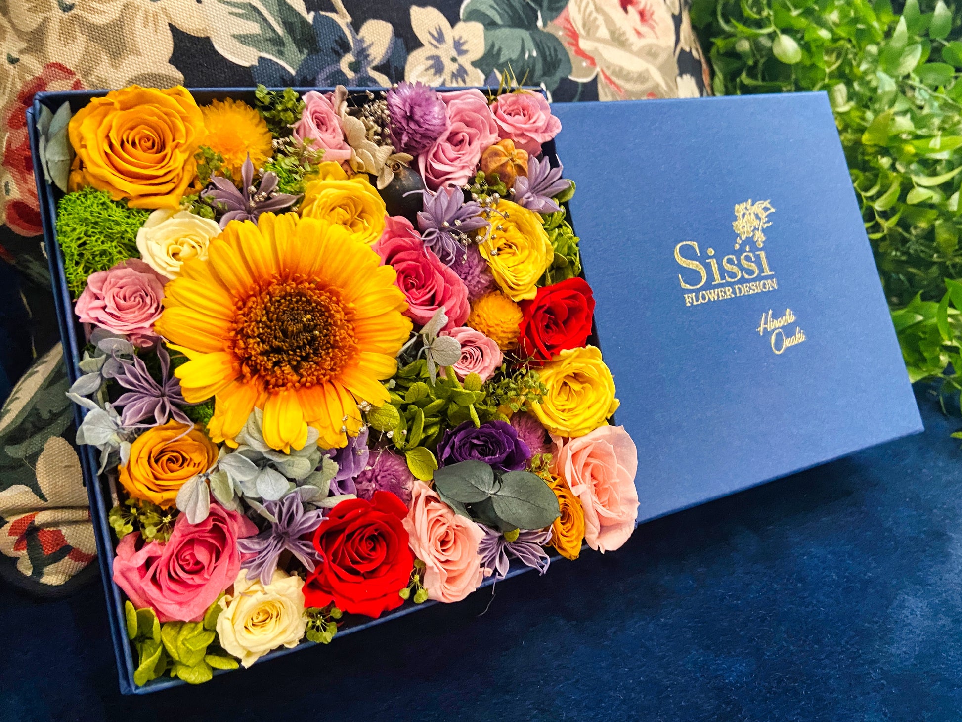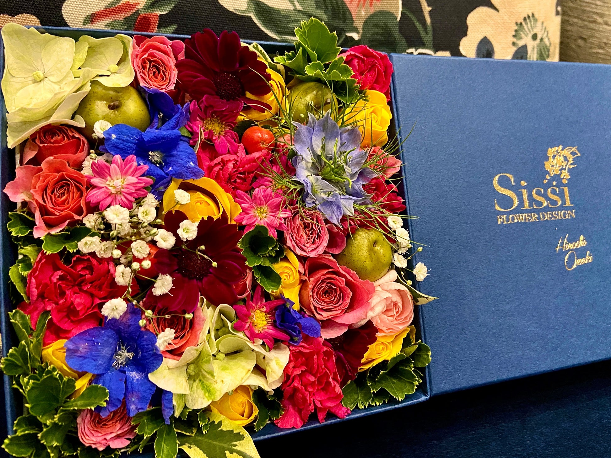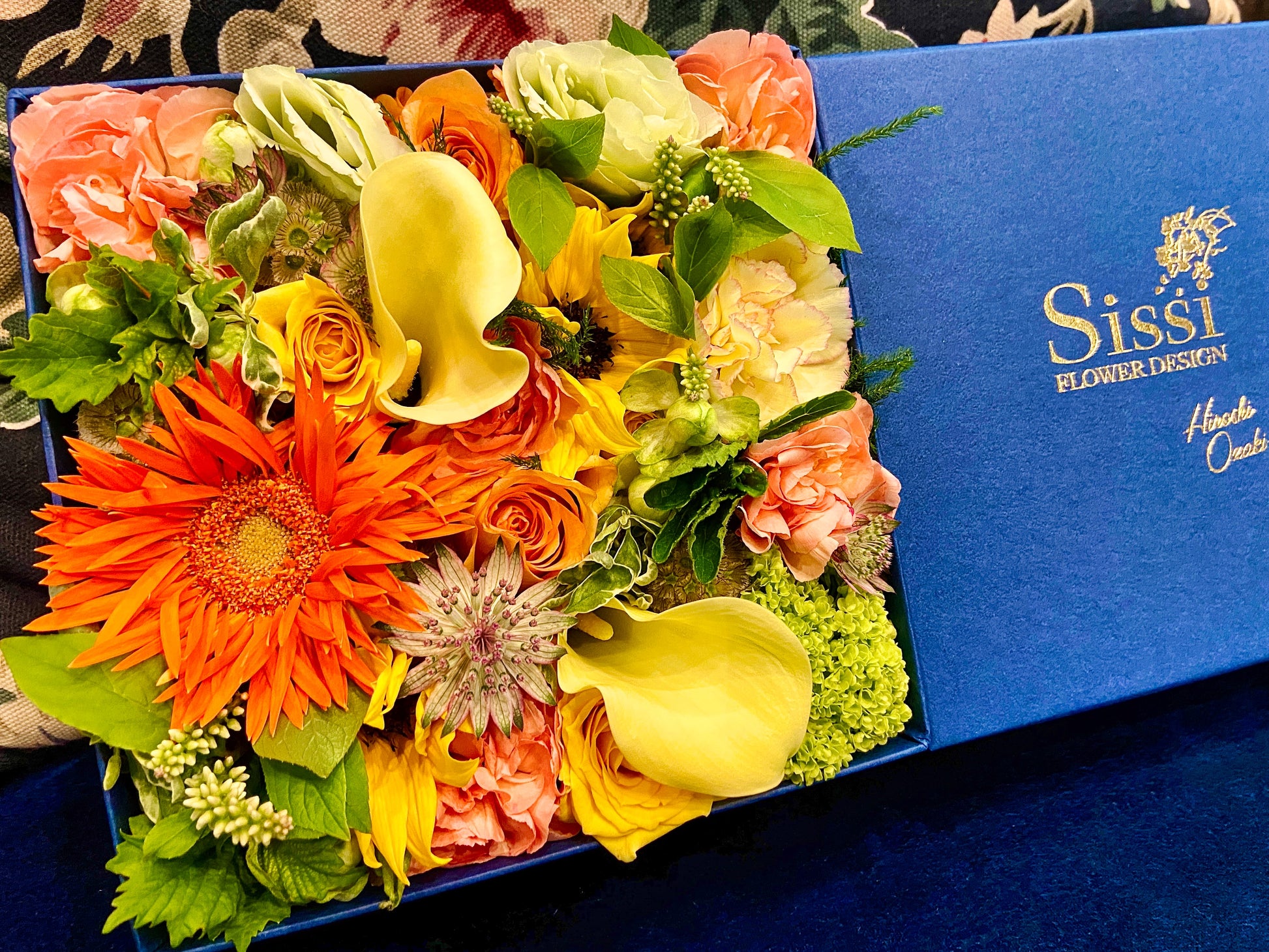 Sissiオリジナルボックスに贅沢にお花を敷き詰めました。 蓋を開けた瞬間に見えるお花に感動をお約束します。 Sissiのオリジナルボックスは高級感あるネイビーに横長の形で従来のボックスフラワーに比べて高級感があります。 男女問わず、色んなご用途のギフトとしてお贈りいただけます。 花の方は基本おまかせにさせていただいておりますが、ご要望があればお伝え下さい。 商品サイズ:縦15.5cm 横15.5cm 奥行7.4cm *アレンジメントは生花ですので、仕入れの状況などにより花材が変更になりますのでご了承下さい。 (お日にちに余裕をもってご注文くださればご希望により近いお花を制作させていただきます。)