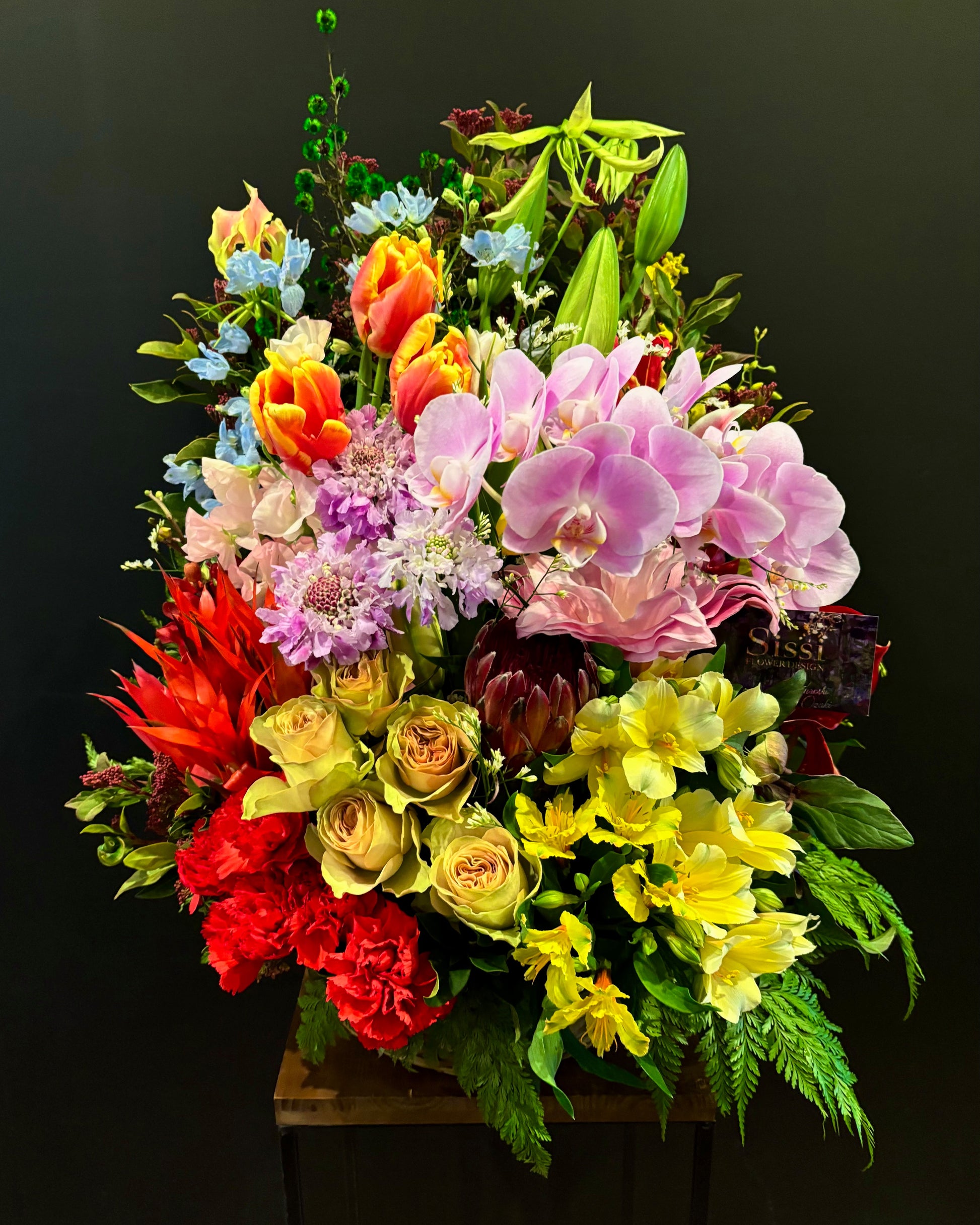 おまかせフラワーアレンジメントになります。 高さのあるスタンダートフラワーアレンジメント。