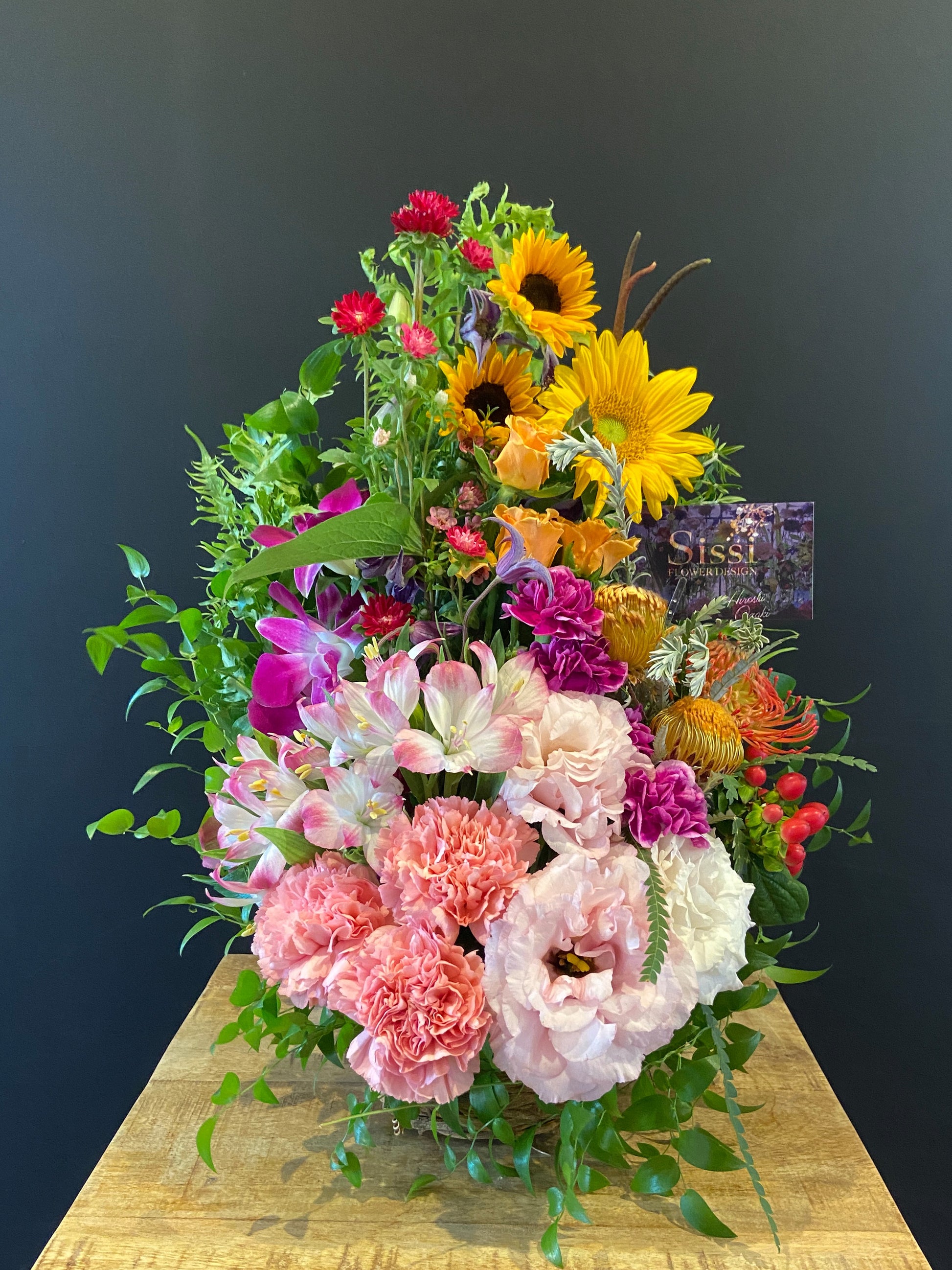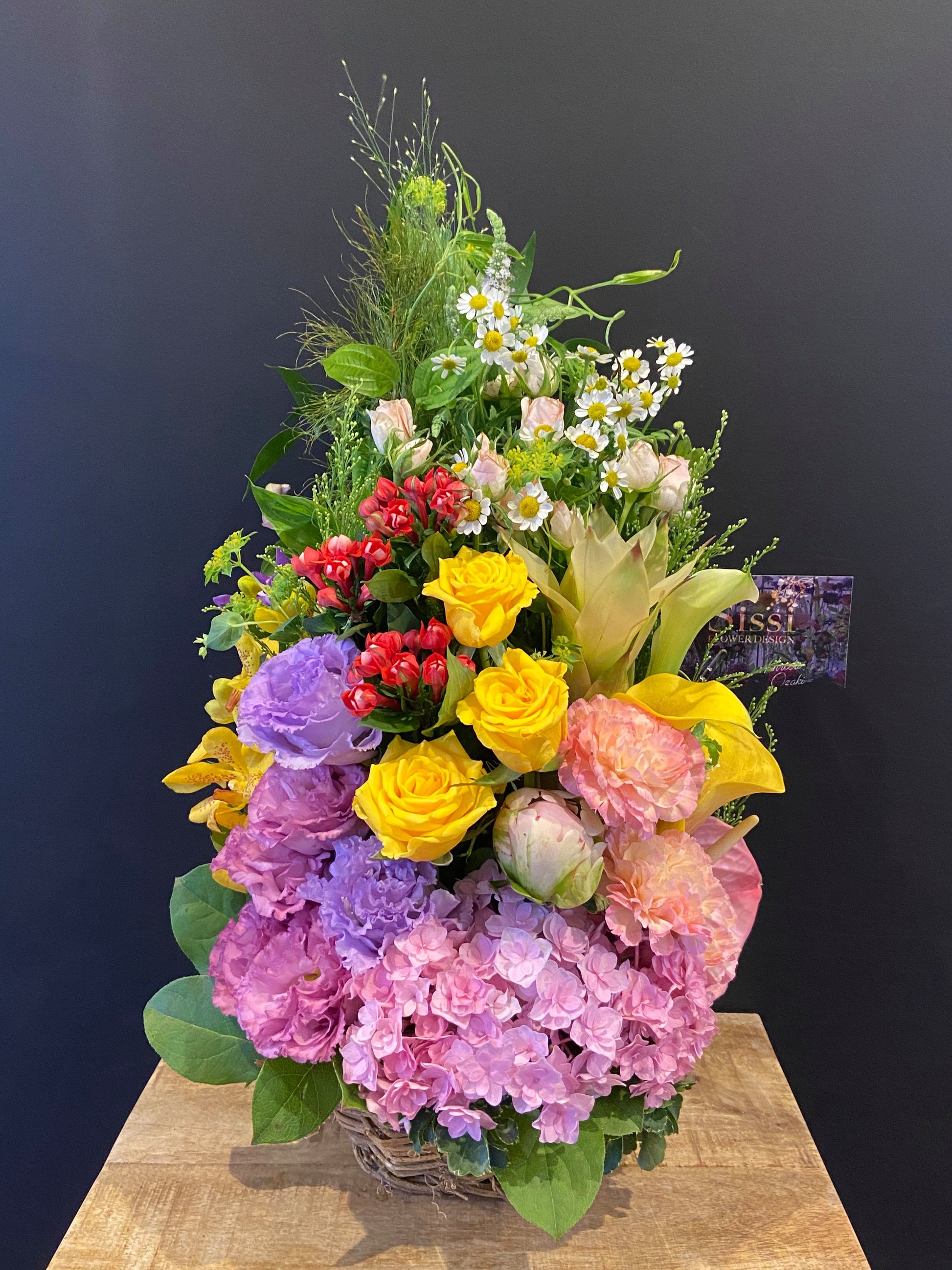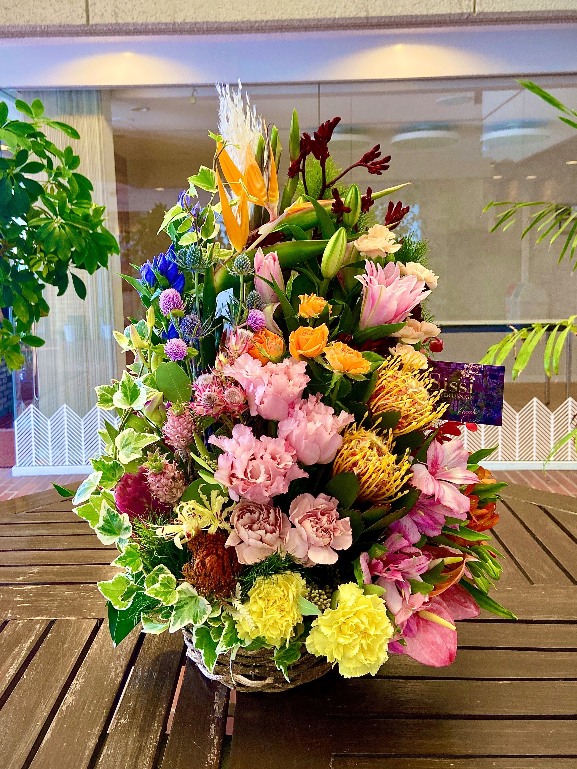 おまかせフラワーアレンジメントになります。 高さのあるスタンダートフラワーアレンジメント。