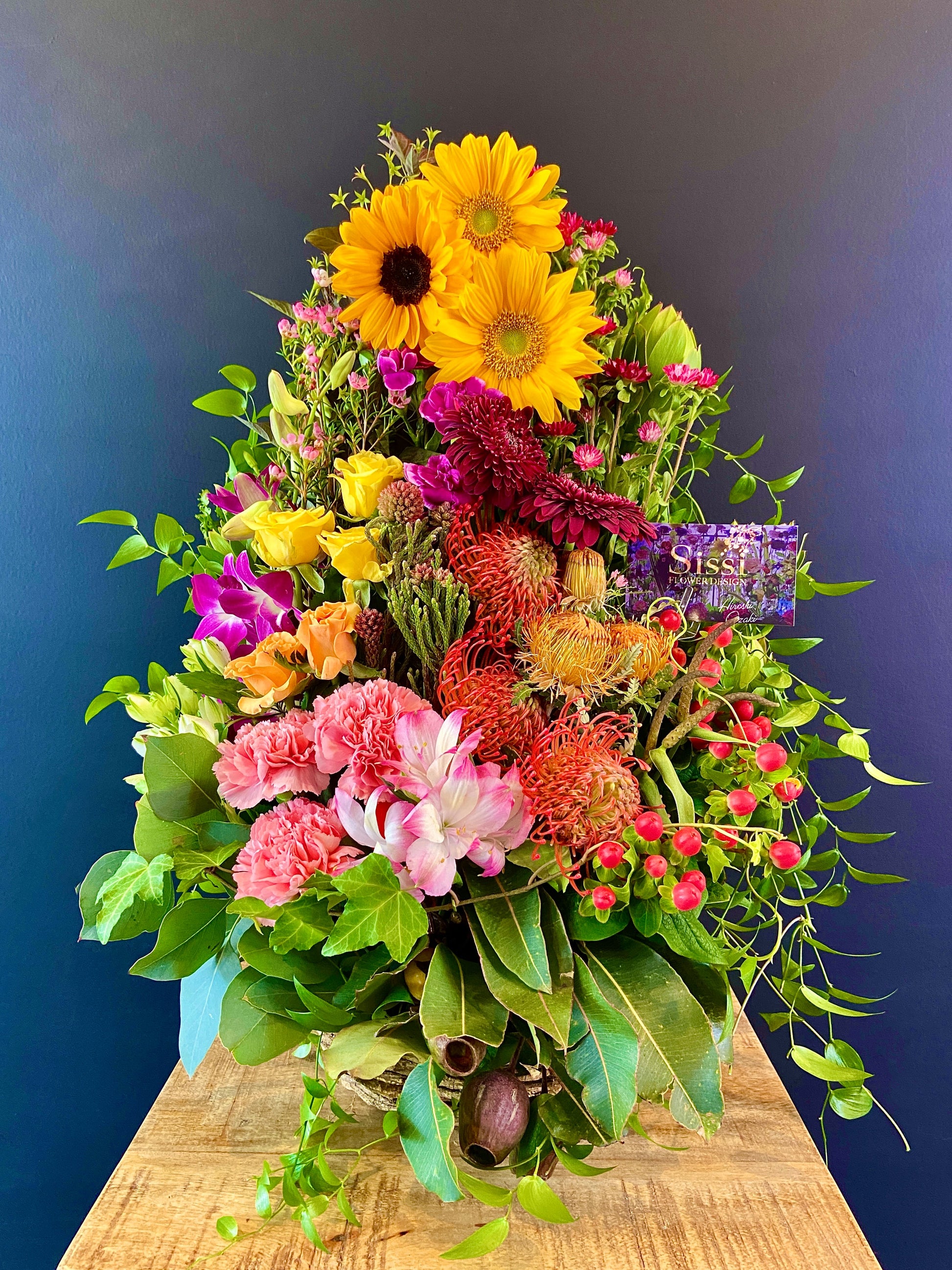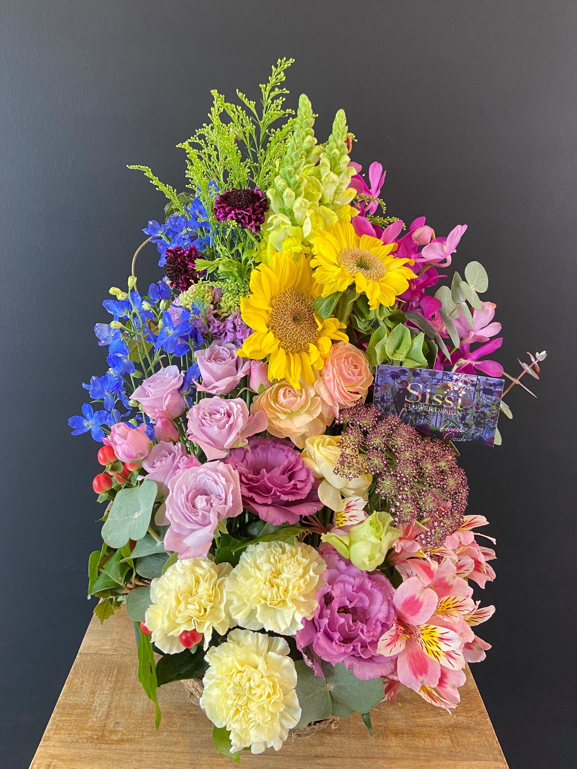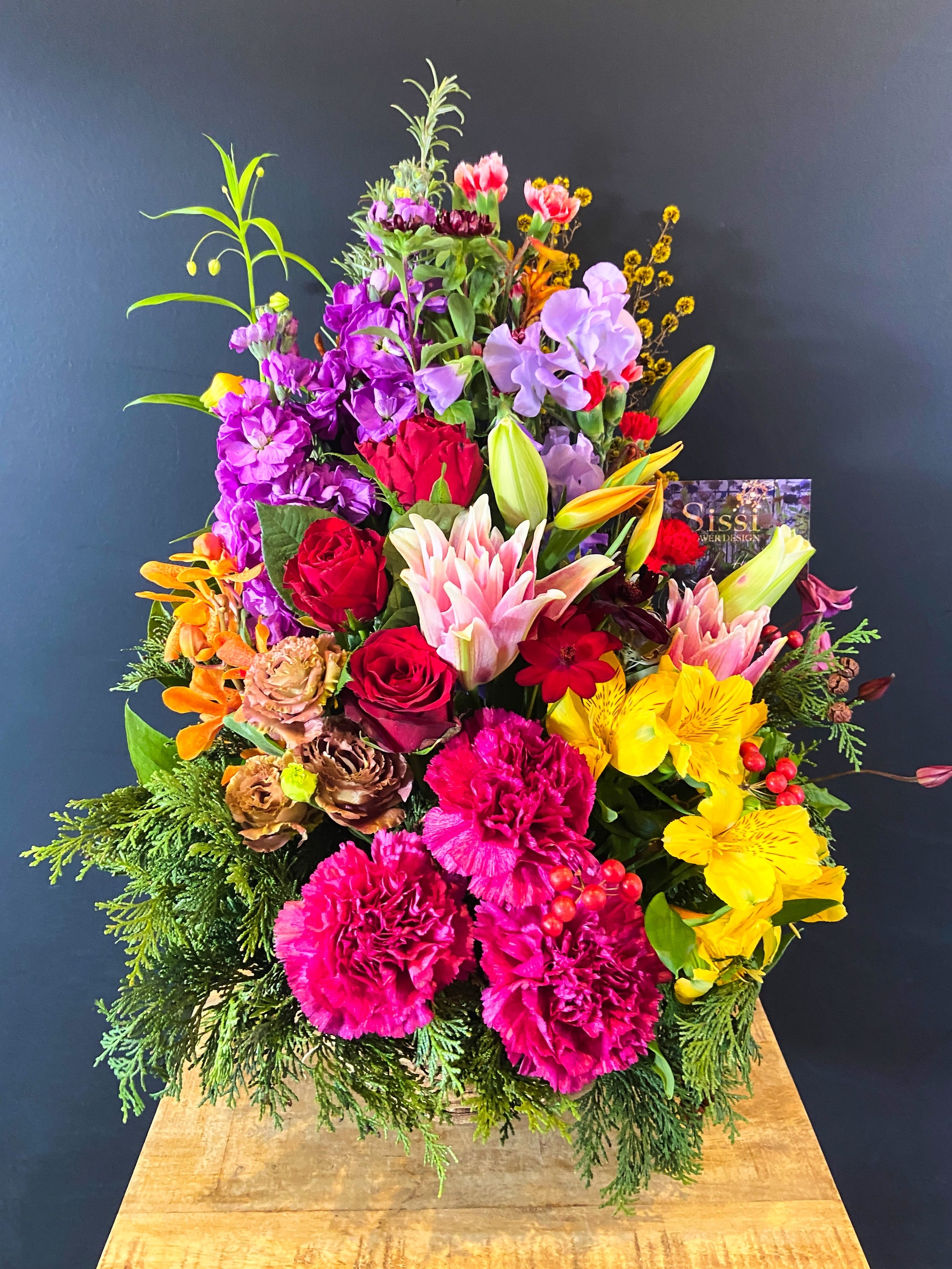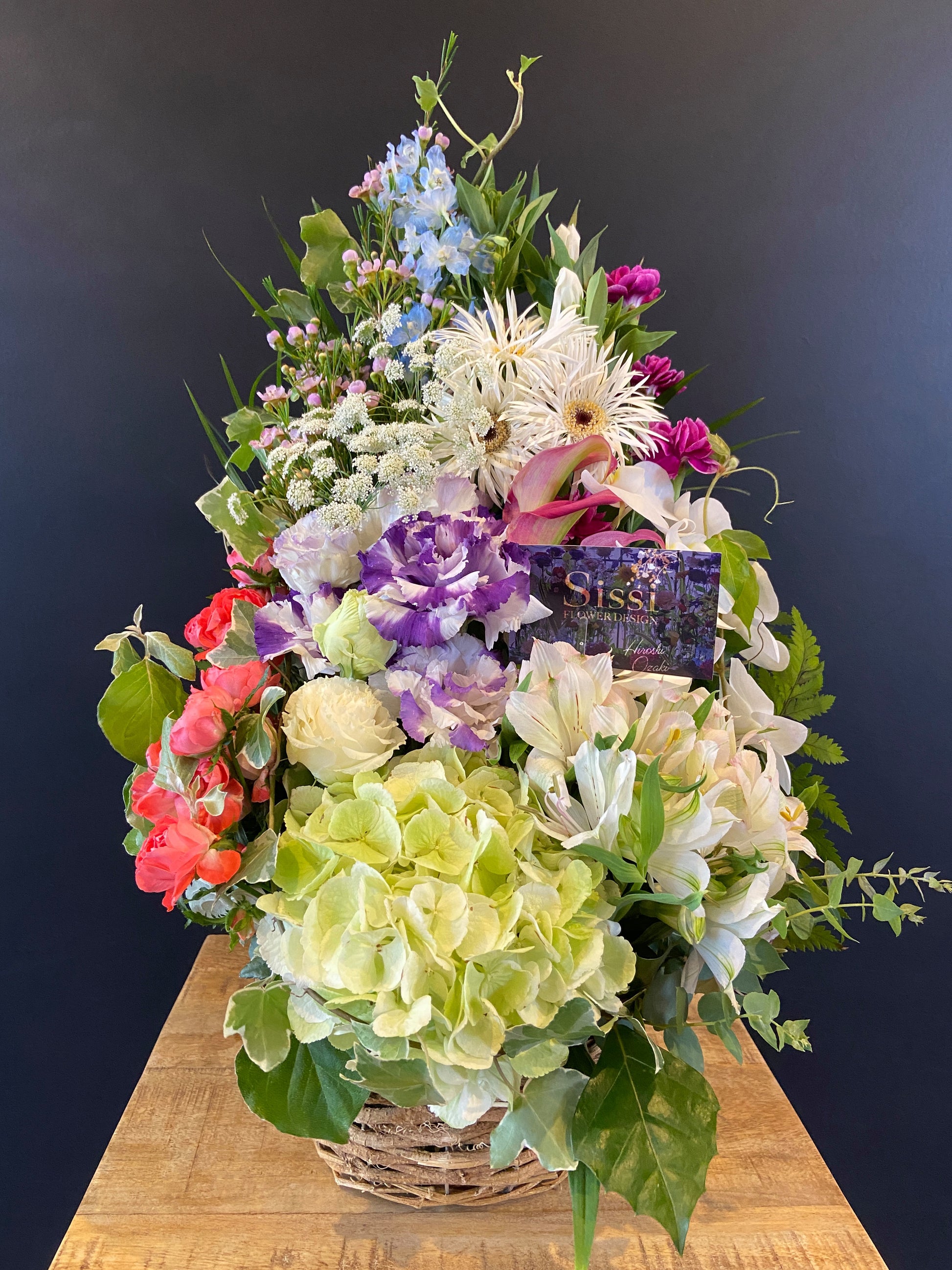 おまかせフラワーアレンジメントになります。 高さのあるスタンダートフラワーアレンジメント。
