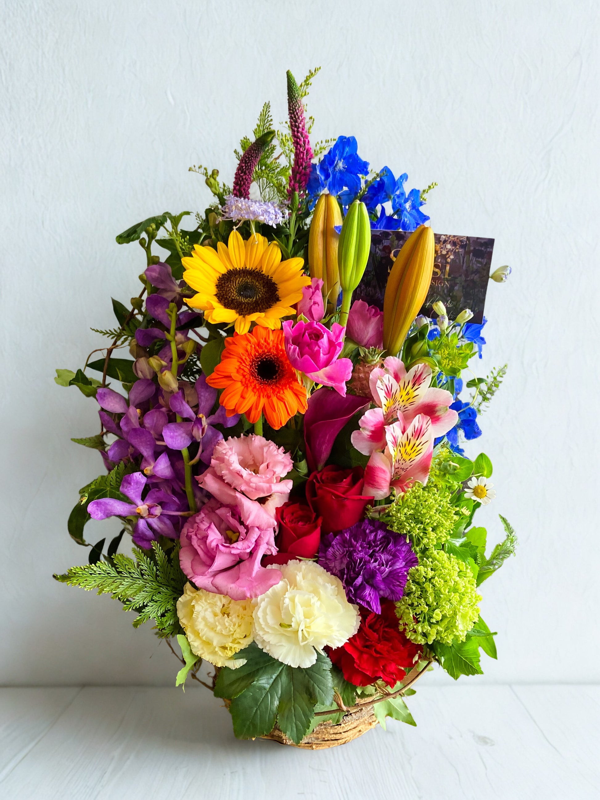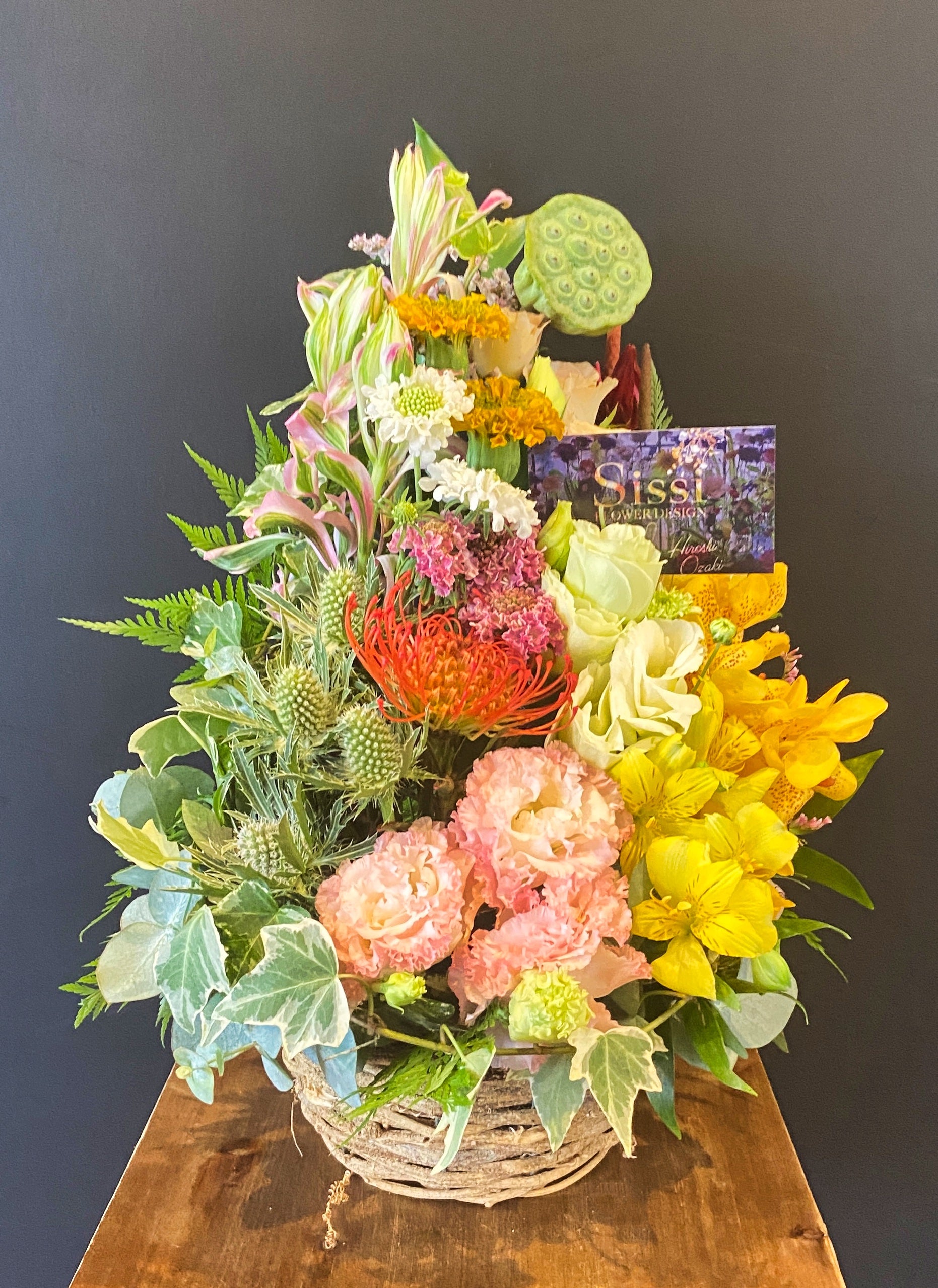 おまかせフラワーアレンジメントになります。 高さのあるスタンダートフラワーアレンジメント。